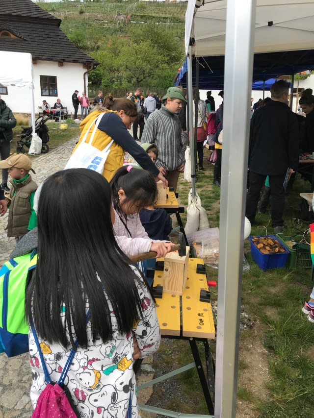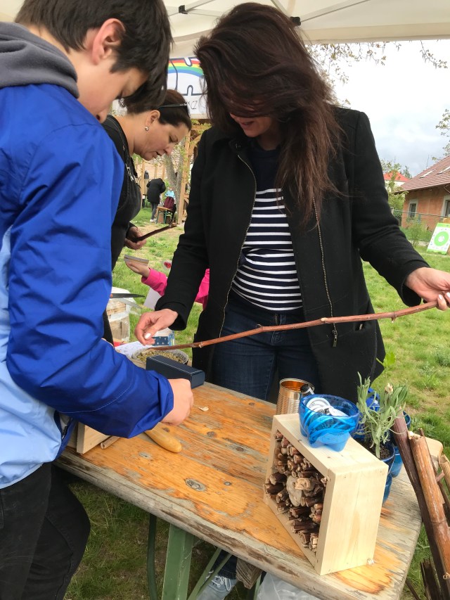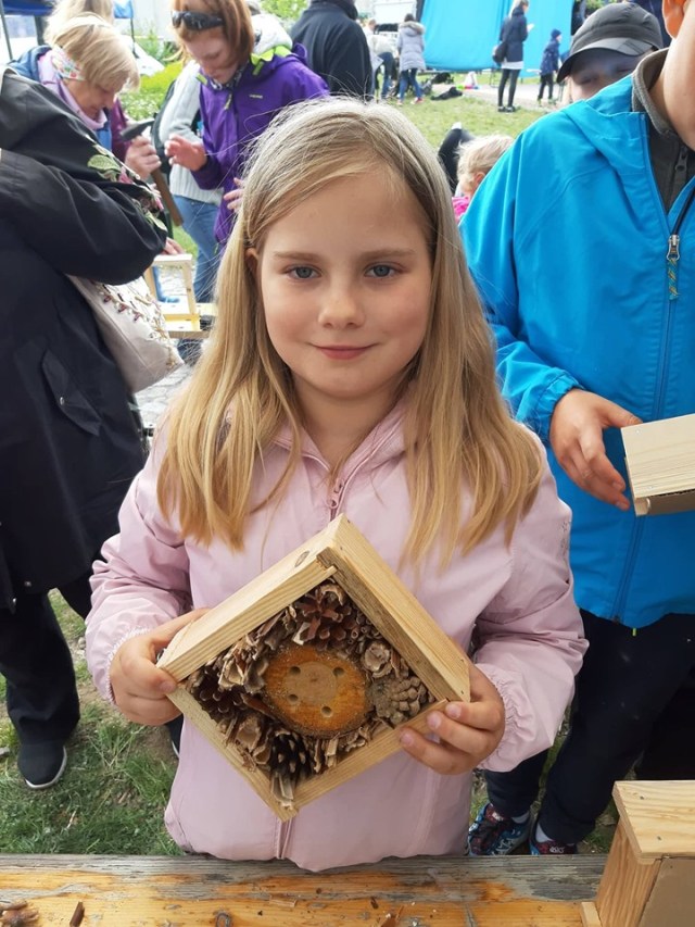 Akci pořádala MČ Praha 12 a my jsme se rádi zapojili. Téma ochrany přírody je nám blízké a tak jsme připravili výrobu hmyzích domečků. Odpoledni předcházelo mnoho příprav, od shromáždění dostatku výplňového materiálu, až po přípravu veškerého potřebného nářadí a pomůcek. Domečky pro včelky samotářky jsme vyplnili šiškami z našeho tábořiště ve Skrýchově, dutinkami křídlatky japonské, na kterou jsme pravidelně chodili k Vltavě u nás v Modřanech. Stojanovou vrtačkou jsme vrtali do polínek z lísky nebo švestky, které jsme také připravili ve Skrýchově. Základ na domečky nám nachystal Vašek Čech ze Sumrakova a udělal to skvěle. Ačkoli jsme měli u stánku nabito a někteří stavitelé hmyzích domečků museli čekat, až se na ně dostane řada, zvládli jsme udělat radost všem, které výroba domku zaujala. Podle našich propočtů se vyrobilo 95 domečků. Ať se vám tam líbí, milé včelky, broučci a berušky.